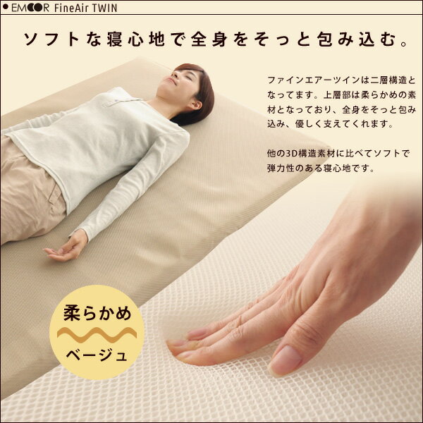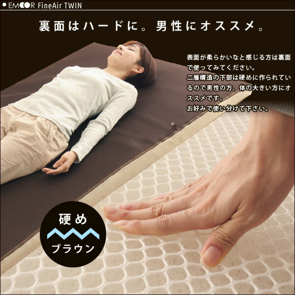 ■ジャンル敷き布団/3D構造/立体構造編物/FineAir/ファインエアー/洗える/丸洗い可能/リバーシブル【キャッシュレスポイント還元】 商品詳細商品名日本製 エムール FineAir TWIN 敷き布団 シングルサイズ/約100×200cmサイズシングルサイズ/約100×200cm素材中材:立体構造編物・約32〜35mm、ソフト立体構造編物・約18〜20mm[側地]表:ゴールドベージュ ハニカムメッシュ170g/m2、ポリエステル100%裏:ダークブラウン ハニカムメッシュ170g/m2、ポリエステル100%カラーベージュ(裏面ブラウン)お手入れ方法丸洗いOK、リバーシブル仕様(表・裏で固さが違います)生産国日本製(国産)配送送料無料となりますが、沖縄・離島のお客さまは別途追加料金が発生します。