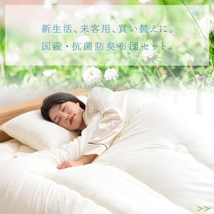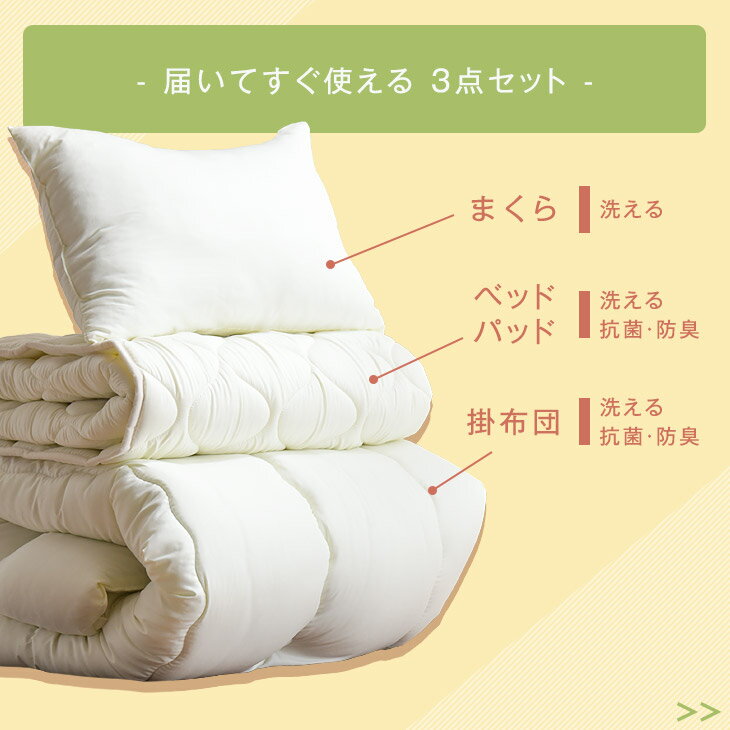 ▼布団の悩みもこれで解決▼ 仕様掛布団サイズ:150X200cm側生地:ポリエステル100%詰め物:ポリエステル綿100%(抗菌防臭綿 シキボウ_ノンスタック使用)1.5kg【スタッフひーちゃんのおすすめポイント!】・掛布団+ベッドパッド+枕のボリュームたっぷり布団3点セット・掛布団+ベッドパッドの中綿は抗菌防臭のノンスタック使用・ほこりの出にくい中空ポリエステル綿使用・寝相をかいてもずれない四隅ゴム付き・洗濯機で洗えていつでも清潔・ISO9001認可工場で生産された安心の品質・安心の日本製ベッドパッドサイズ:100X200cm側生地:ポリエステル100%詰め物:ポリエステル綿100%(抗菌防臭綿 シキボウ_ノンスタック使用)1.0kg枕サイズ:43×63cm側生地:ポリエステル100%詰め物:ポリエステル綿100% 0.4kg梱包サイズ51x47x39cm生産国日本製備考 【洗濯OK】【販売開始:2020年3月13日】※配送は全て宅配便(1人)での玄関渡しとなります。